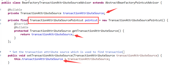TransactionAttributeSourcePointcut类以Pointcut结尾,说明它是一个切入点,就是标识要被拦截的方法。类名的前缀部分表明了这个切入点的实现原理。