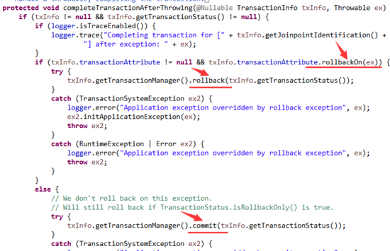 判断异常类型是否需要回滚,需要的话就回滚事务,不需要的话就继续提交事务。
