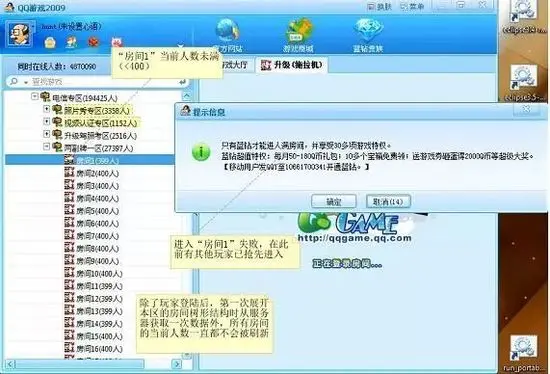 腾讯QQGame游戏同时在线的玩家数量极其庞大,为了方便组织玩家组队游戏,腾讯设置了大量游戏室(房间),玩家可以选择进入属意的房间,并在此房间内找到可以加入的游戏组(牌桌、棋盘等)。玩家选择进入某个房间时,必须确保此房间当前人数未满(通常上限为400),否则进入步骤将会失败。玩家在登入QQGame后,会从服务器端获取某类游戏下所有房间的当前人数数据,玩家可以据此找到未满的房间以便进入。