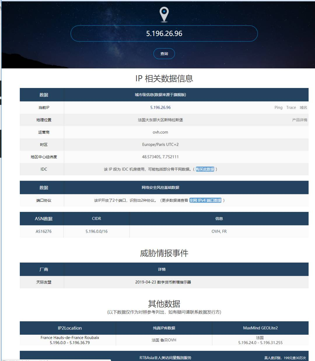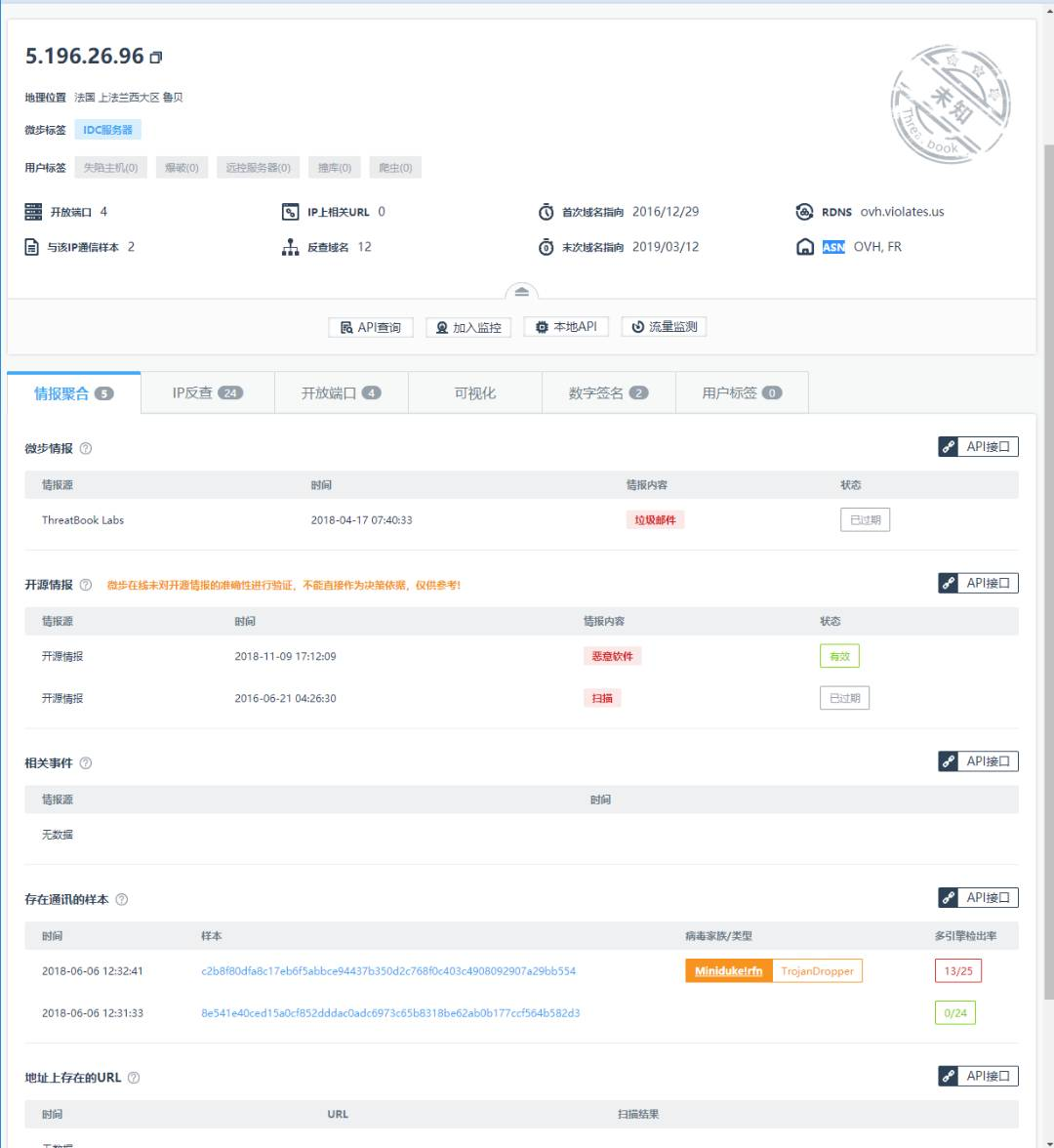 为了进一步确认,再次到威胁情报平台进行查询 x.threatbook.cn/ip/5.196.26… 。