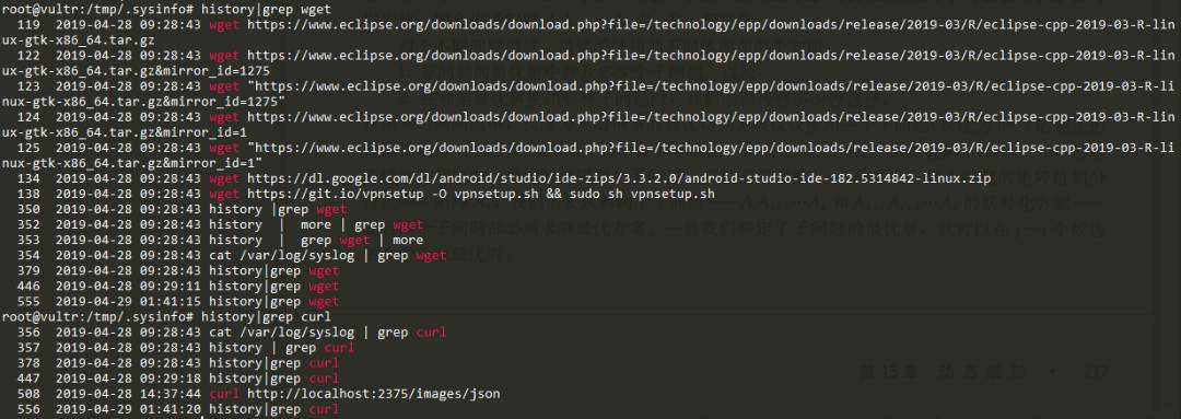 挖矿程序一般都是由木马下载脚本然后执行,所以用history命令检查一下下载行为。