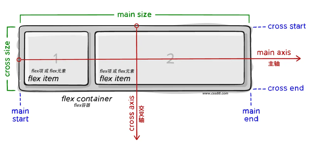 在flex布局中,flex 项(就是子元素)要么按照 main axis(主轴)(从 main-startmain-end )排布,要么按照cross axis(交叉轴) (从 cross-startcross-end)排布。