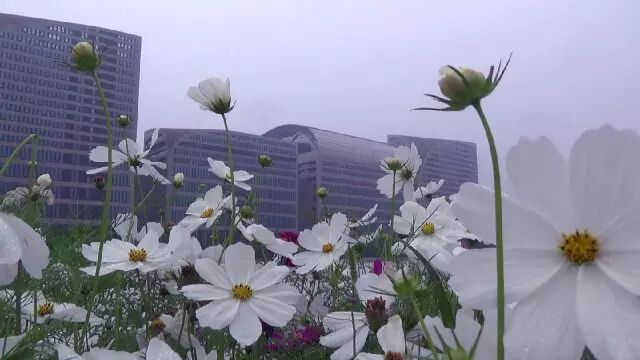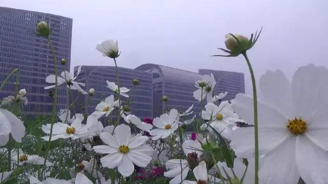 大片色彩各异的鲜花团簇在高楼大厦前,给每日身陷繁琐工作中的我们一丝安宁。