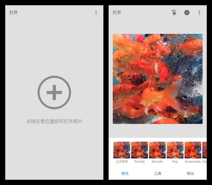 用 Snapseed 打开一张照片后,我们便可以看到其整体的界面布局:底部栏分别为样式、工具和导出功能,顶部栏分别为打开新照片、操作记录、图片信息以及更多(设置、教程、帮助和反馈)功能。