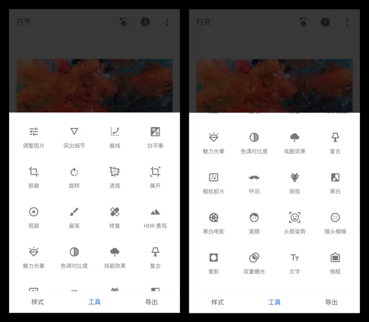 导入照片后,样式是第一个呈现的页面,但通常情况下,这里我们直接切换到工具即可。因为 Snapseed 所提供的这些样式的适用性非常糟糕,同时还无法选择应用程度,以导致这个功能基本是无用的。
