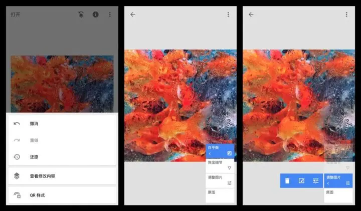 在操作记录里,我们可以进行撤销、重做以及还原操作。在「查看修改内容」里,还可以重新调整或删除某单个调整项,对于大部分调整项,都可以在这里使用画笔来将其调整为局部处理。(画笔是 Snapseed 里比较重要的一个工具,本文后部分会有详细介绍。)