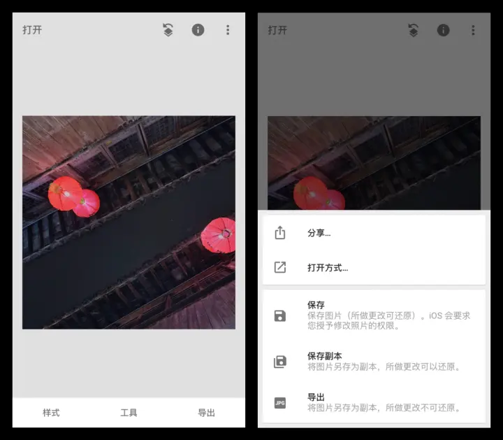 iOS 和 Android 两个版本的导出功能有所区别,具体实现的功能可以查看小字描述部分。其中 iOS 可以以三种方式导出,分别是:覆盖原图的保存(图片可再次修改)、另存为的保存(图片可再次修改)、另存为的保存(图片不可再次修改)。