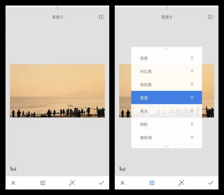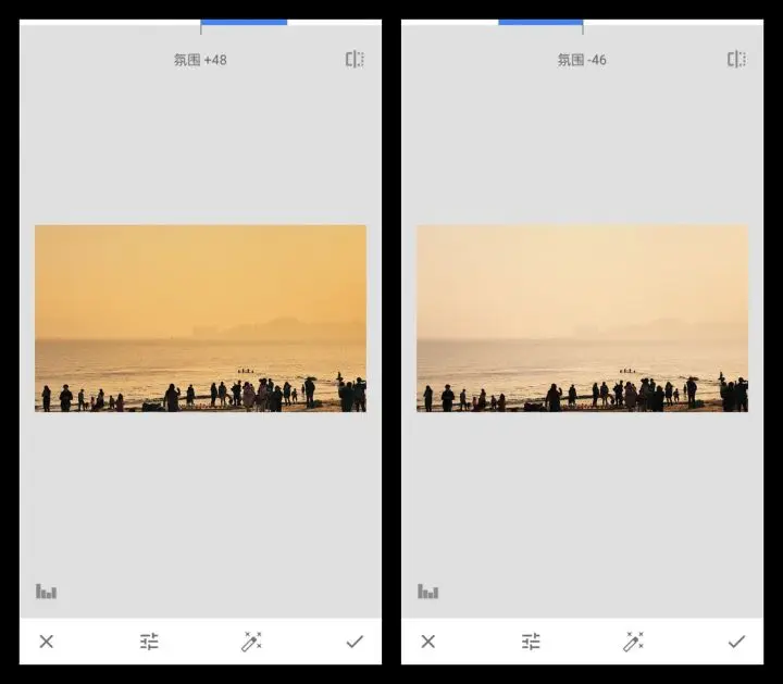 其中氛围是 Snapseed 里特有的一个调整项,实际上是一个综合调整,随着氛围的添加与减少,照片风格会随之变化,最大的区别体现在高光和阴影上。