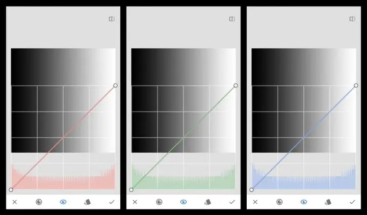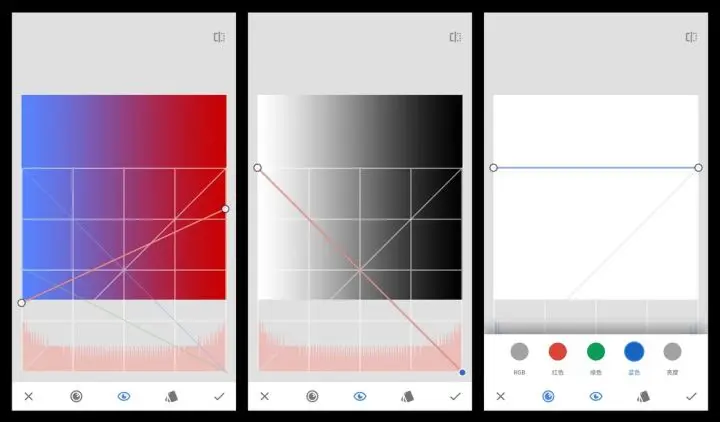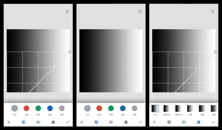在 Snapseed 的曲线工具界面里,分别是曲线选择、显示与隐藏、预设曲线三部分,在曲线选择里,我们可以选择当前调整的曲线是 RGB 还是红色、绿色、蓝色、亮度等,这里亮度是 Snapseed 里特有的一个调整曲线,其余四个则为常见的曲线。