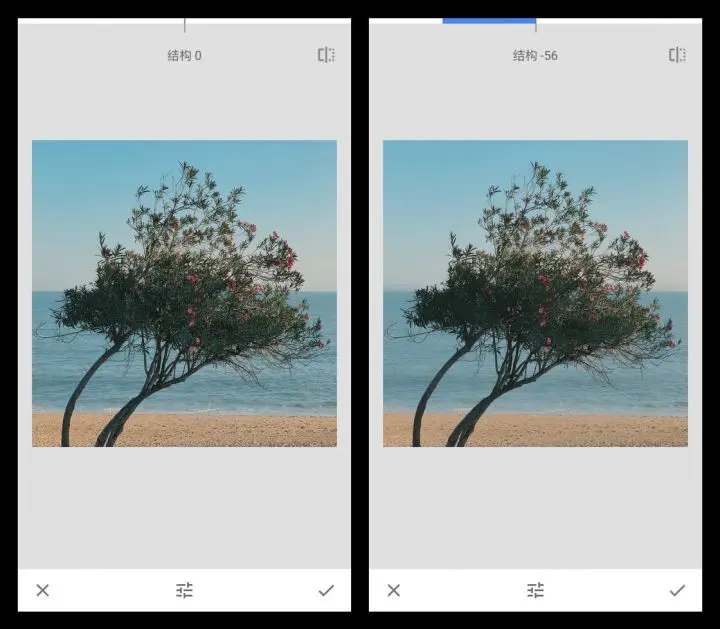 突出细节里提供了结构和锐化调整,锐化与 VSCO 无区别,结构则对应着 VSCO 里的清晰度,但这里的结构是支持双向调整的。