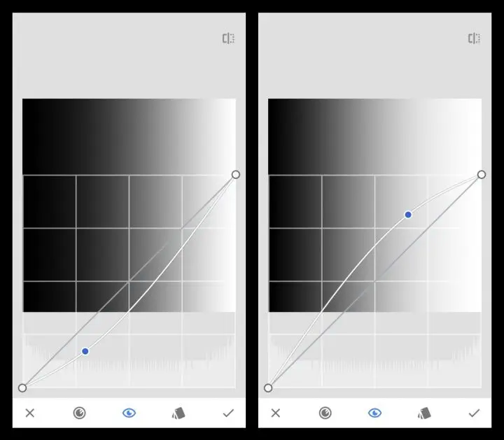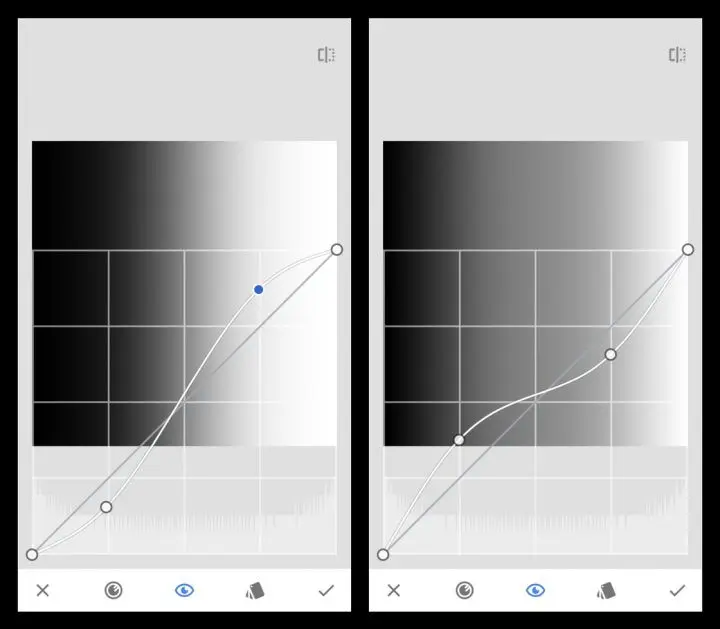 再例如这样的曲线,可以看到左边操作是将暗部变暗,而亮度提亮,所以画面整体上暗的部分变得更暗,亮的部分变得更亮,于是整体观感是对比度提高。右边的操作则反之,使得画面整体观感变得柔和,也即对比度降低。
