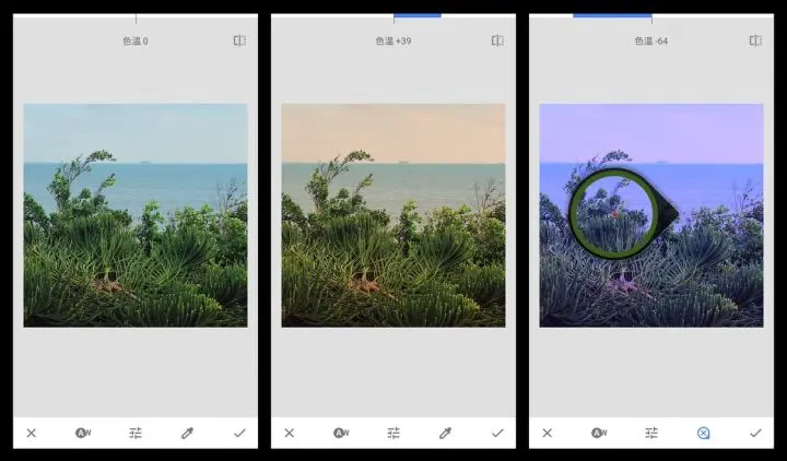 白平衡里提供色温和着色,对应着 VSCO 里的色温和色调,也是冷暖和绿紫两个方向的调整。在底部的三个选项里,分别对应着自动调整、调整工具、取色调整。