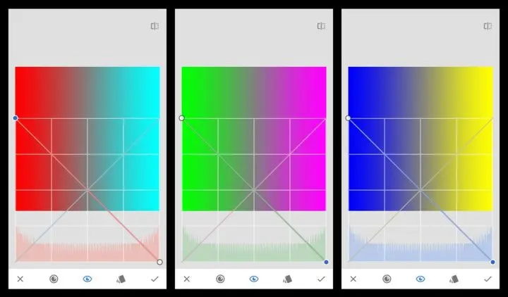 在调整色彩曲线时,实际上是对照片添加或减去某一种颜色。在图片的操作里,我演示了三种极端情况,均是在最暗处添加满当前曲线的颜色,而在最亮处完全删去当前曲线的颜色。