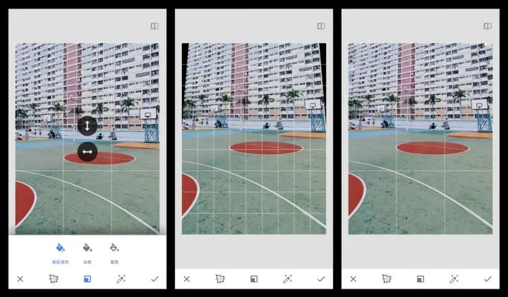 剪裁、旋转、透视这三个工具,Snapseed 里分为了三个小工具,但实际上属于一类调整。其中剪裁和旋转不必多说,透视工具相对于 VSCO 更加完善,着重说一下。