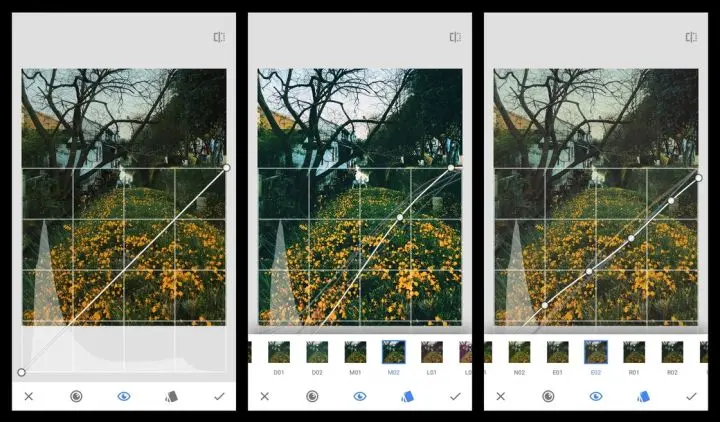 Snapseed 里提供了曲线工具,通过曲线工具,我们可以对照片进行调色上的任意处理,除了亮度、对比度、高光、阴影等常规调整外,还可以对色彩进行最大自由化的调整。