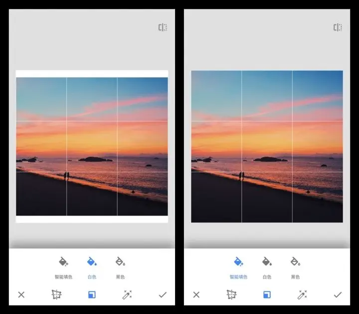 在正式调整前,建议先根据自己的图片情况调整填充色。在绝大部分情况下,建议选择黑色或白色,因为智能填色是有局限性的,情况一旦复杂就像图片上那样变得不自然。