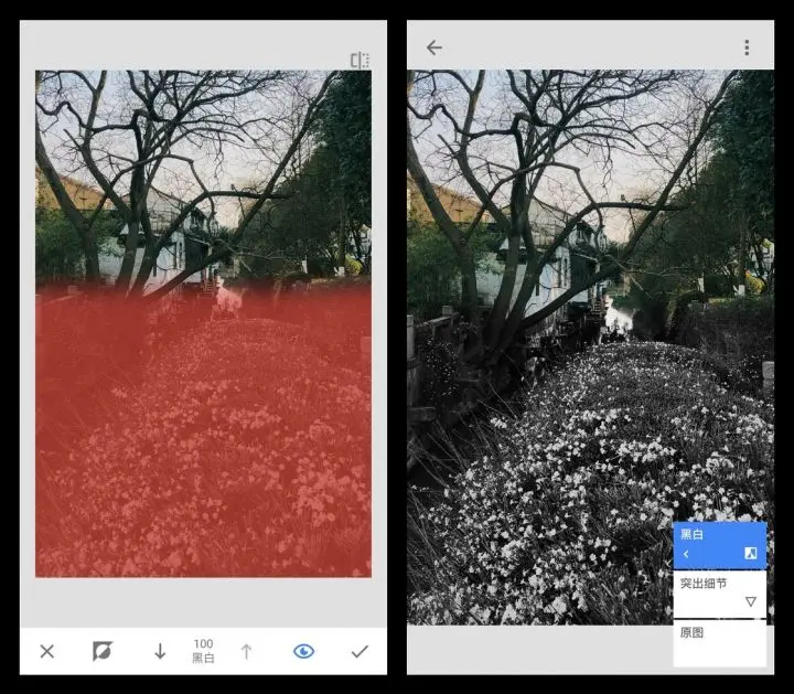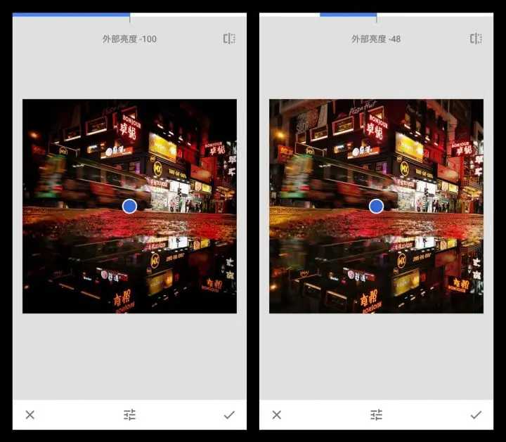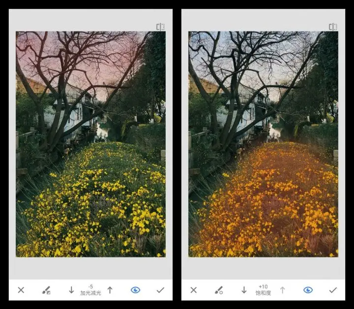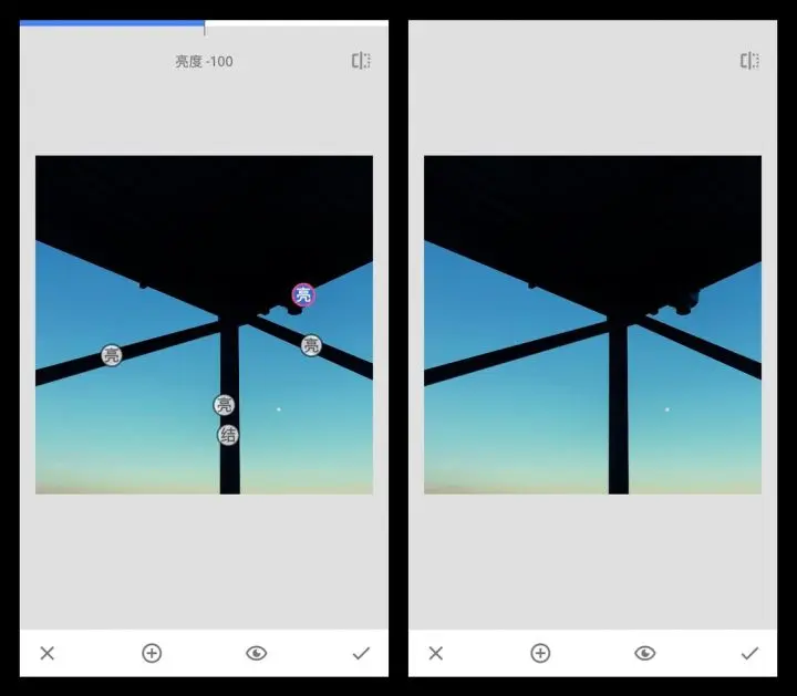 除此之外,调整幅度更大也是 Snapseed 与 VSCO 的区别。在这里,高光与阴影均可以双向调整,而不是像 VSCO 上只能进行高光减弱和阴影补偿。当我们需要去掉高光或阴影的细节时,就需要进行相对应的反向调整。