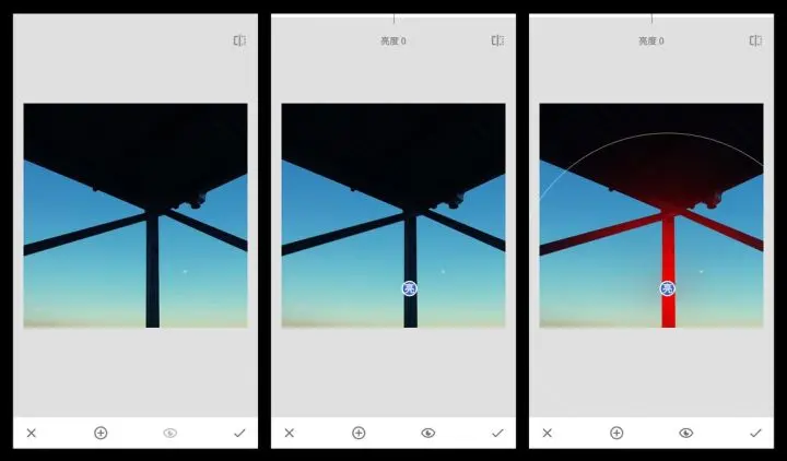 在局部处理里,你可以添加一个个小点来选择自己处理的地方,双指捏合缩放可以调整当前小点的应用范围。为了画面更自然,这个小点还带有色彩识别,只会调整应用范围内画面色彩接近的部分。