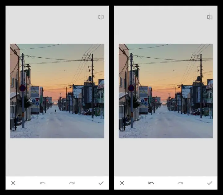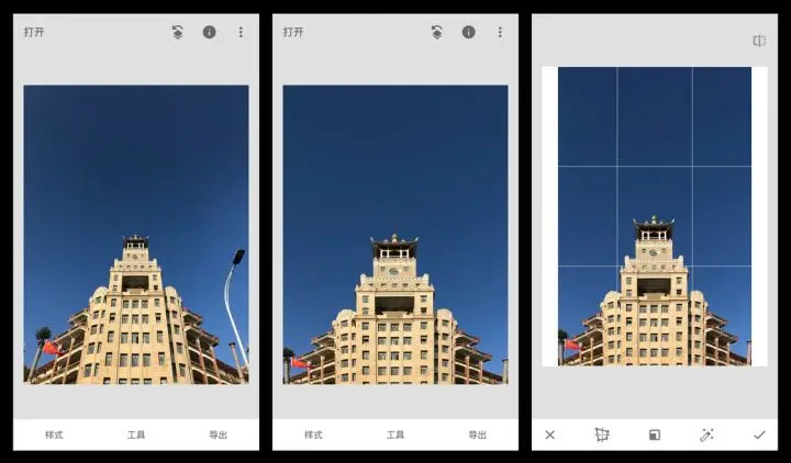 Snapseed 的透视工具比 VSCO 更加完善,但调整的算法并没有 SKRWT 好。如果你有大幅度调整的需求,使用 SKRWT 来处理是更好的选择。
