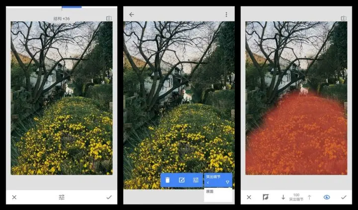 除了工具里的画笔,我们还可以在操作记录里来启用画笔,通过这样的方式让每个调整项都变成局部调整。例如图片中我调整照片的结构,最后通过画笔让结构增加只应用在花丛部分。