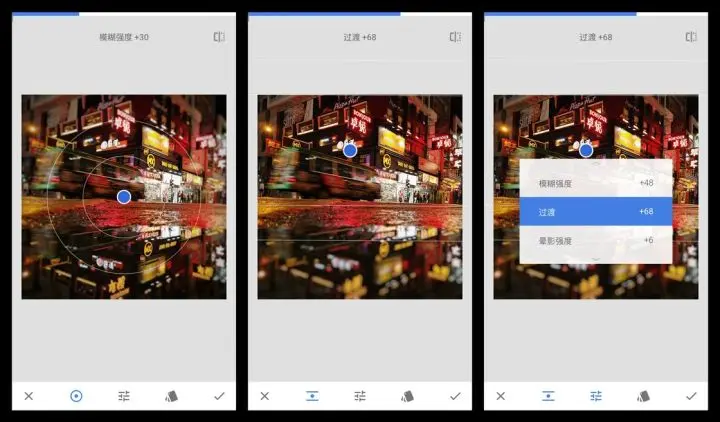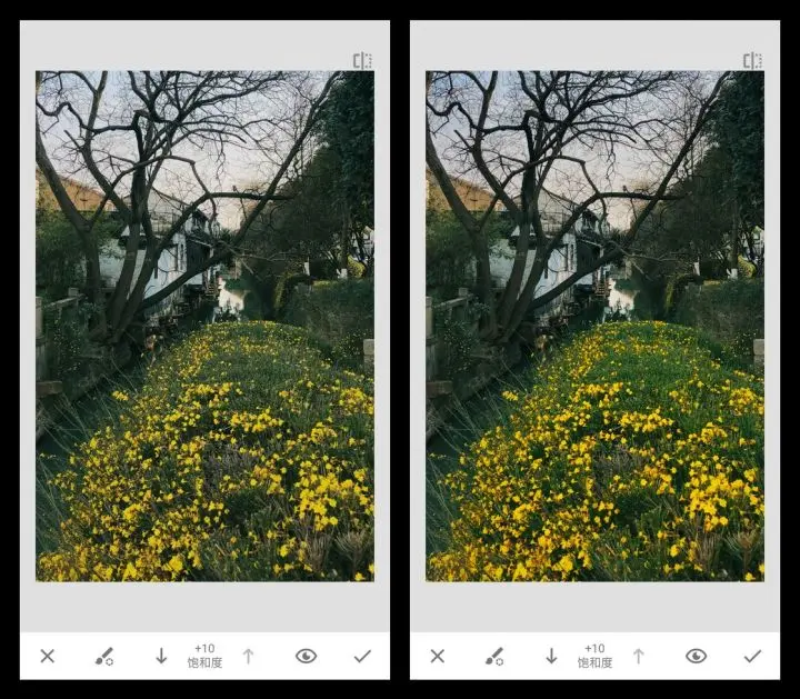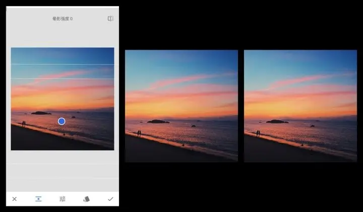 在实际使用时,由于 Snapseed 的暗角调整范围比较大,比较容易调出不自然的状态,一定注意不要调整过度。