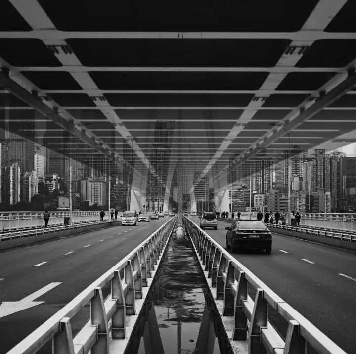 风格接近或情绪接近的照片也可以用于双重曝光制作,个人建议是要色调一致,例如我选择的两张同场景的黑白照片。同样,选择合适的混合模式以及不透明度后,再利用画笔来进行调整。