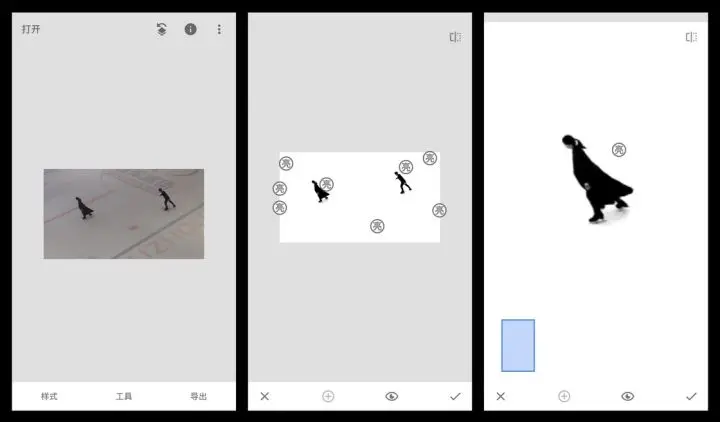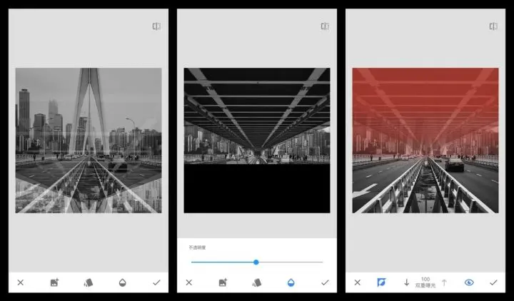 利用双重曝光功能,我们可以制作出一些极具创造性的照片出来。在 Snapseed 的双重曝光工具里,底部三个选项分别为添加新照片、混合模式以及叠加照片的不透明度。