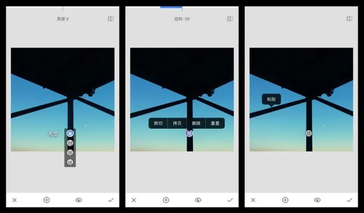 这些小点提供了亮度、对比度、饱和度、结构四个调整项,我们可以通过上下滑动来进行切换,左右滑动进行调整。单击某个小点,还可以进行剪切、拷贝、删除或重置。