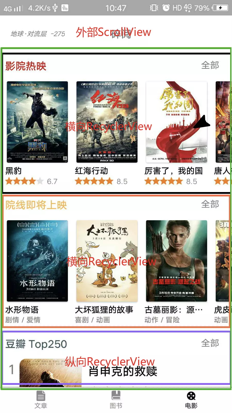 从图中可以看出,一个ScrollView内部嵌套三个RecyclerView,其中两个RecyclerView是横向,一个RecyclerView是纵向。