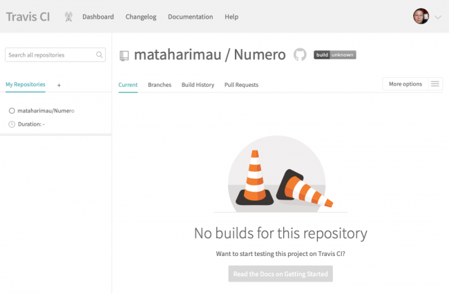 好的,你们都准备好了! 保存.travis.yml,然后提交并将更改推送到GitHub。 在Travis CI Numero存储库页面上,单击Build History。 很快你就会看到你的第一个构建开始: