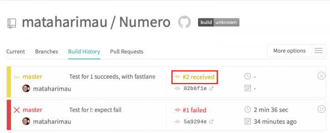 提交并推送到GitHub。 在Travis CI Numero存储库页面上,单击Build History,然后单击#2 - 可以received, booting or started其状态。