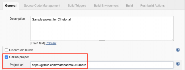 项目配置页面有几个选项卡。 从第一个开始 - General - 您需要做的就是检查GitHub project,然后将您的存储库URL粘贴到出现的Project url字段中。 为简单起见,请确保使用HTTPS而不是对GitHub的SSH访问。