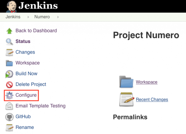 首先,设置Jenkins项目以期待来自GitHub的通知:使用Numero菜单返回到Configure: