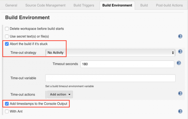 下一节是构建环境(Build Environment):有时构建会继续进行,即使在控制台日志显示已完成之后,因此,请检查Abort the build if it’s stuck并选择No Activity作为超时策略(Time-out strategy)。 如果您想知道事情何时发生,还要检查添加时间戳到控制台输出(Add timestamps to the Console Output)。