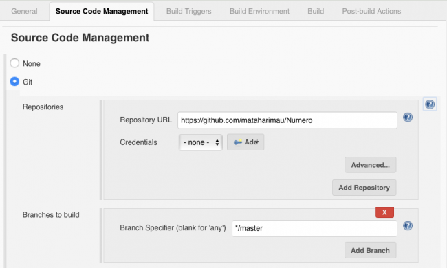 接下来,向下滚动或单击Source Code Management:选择Git并再次粘贴您的Repository URL。