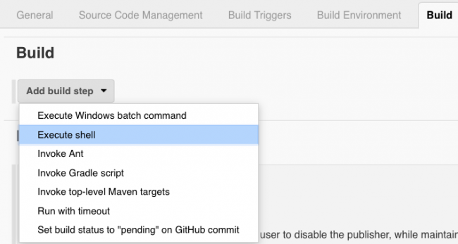 最后,构建部分就是进行工作的一切! 在Add build step步骤菜单中,选择Execute shell: