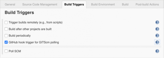 选择Build Triggers选项卡并选中GitHub hook trigger for GITScm polling:
