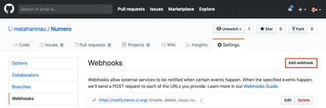 Numero存储库页面上,单击Settings,选择Integrations & Services,然后单击Travis CI行中的Configure。滚动到底部,然后单击