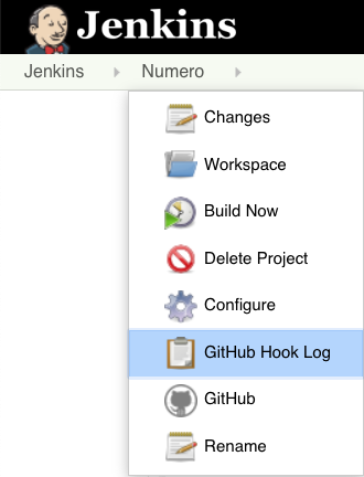 提交并推送到GitHub,然后检查你的Jenkins页面 - Numero的菜单现在有一个项目GitHub Hook Log!