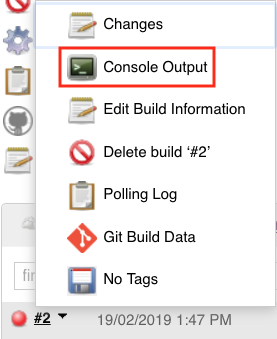 在Build History部分开始发生一些事情 - 你的第一个版本出现了! 将光标悬停在#1上以显示菜单按钮,然后从菜单中选择Console Output: