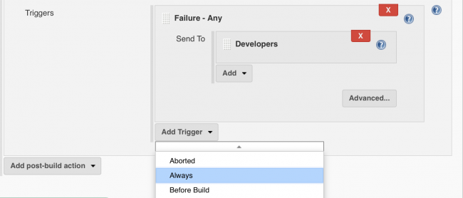 要复制Travis CI的默认行为,请从Add Trigger菜单中选择Always: