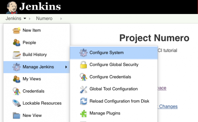 现在配置Jenkins系统:使用Jenkins菜单选择Manage Jenkins ▸ Configure System: