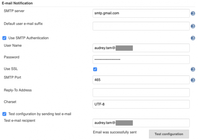 现在返回Jenkins并单击Test configuration。 稍等一下,您应该看到“Email was successfully sent”。 查看您的电子邮件,找到:
