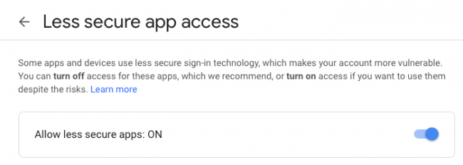 在单击Test configuration之前,还需要做一件事。 由于Google已加强安全性,请转到Less secure app access并将开关弹至ON: