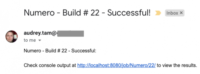 Travis CI还有另一个有用的默认行为:它发送电子邮件通知您构建结果。 您可以设置Jenkins来执行此操作,但您必须做一些工作。