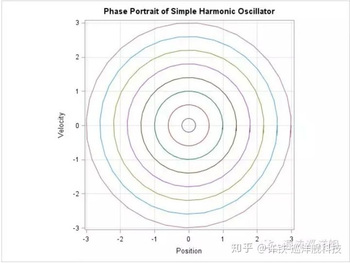 y轴上半 - 此处特征值为纯虚数, 实部为0, 我们既不趋近也不远离, 这也就是周期运动, 或被称为极限环。 系统围绕定点做圆周运动,是稳定和不稳定的过度状态。 典型例子如二维谐振子 - 理解各种复杂的物理系统的毕达哥拉斯之剑。 加入一定非线性形式我们得到猎手-猎物方程, 狼和羊, 资本和劳动力矛盾下的振动平衡。 自然界还是人类现象中振动如此普遍, 背后正是这类动力关系的体现。