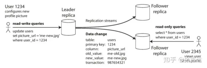 下图就是一个数据复制的应用场景:一个用户有写入操作更新到写库,然后其他用户可能从从库中读取数据,可能数据是最新的,也可能出现从库由于延时不是最新的,复制系统针对这种场景化分为了几种复制方式。