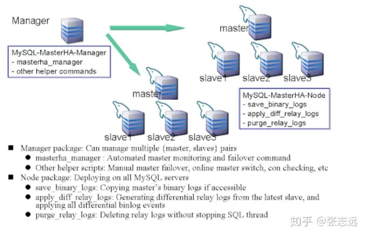 mha node(数据节点): 运行在每台 mysql 服务器上,作用是拷贝 master 二进制日志;然后拥有最新数据的slave上生成差异中继日志,应用差异日志;最后在不停止SQL线程的情况下删除中继日志。