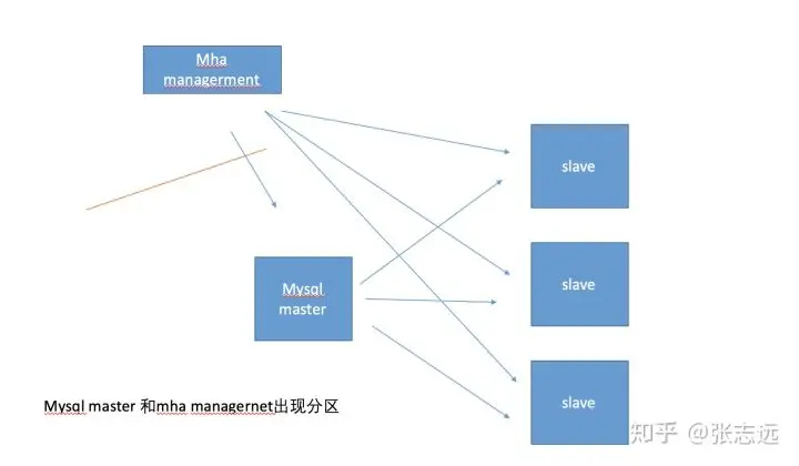 mha 的网络分区和上边提到的有点不同,由于集群只有一个 mha management(注意这里只能部署一个management,不允许部署多个,否则会出现异常),所以 mha management 不存在脑裂问题,这里指的网络分区指的 mha management 节点与 mysql master 节点出现分区,如下: