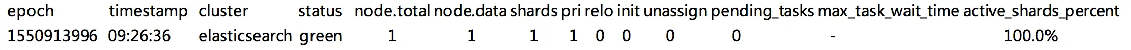 此外,我们也可以借助ES的cat API查看集群的健康情况,不过cat API的输出结果并不是以json格式返回的,而是以不带表头的表格形式返回的,为了方便理解,我们可以通过添加参数v来将表头也输出出来。GET _cat/health?v